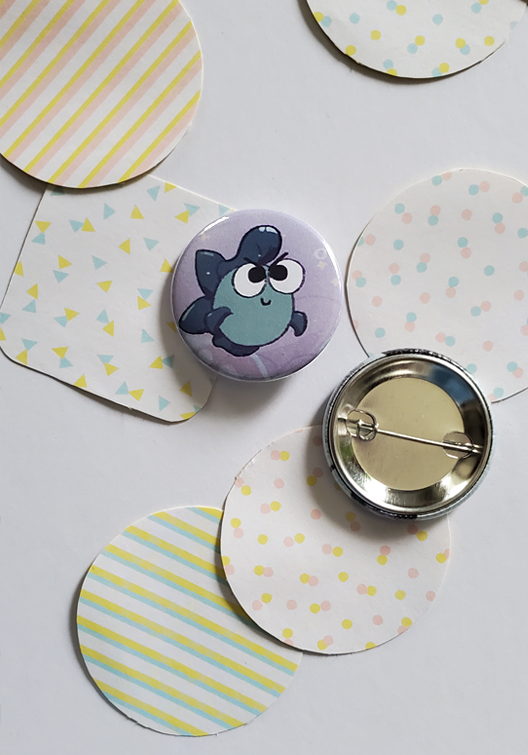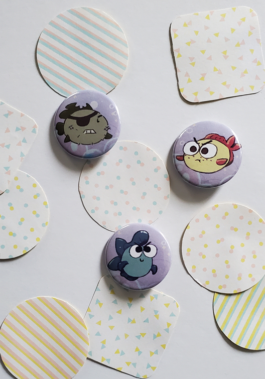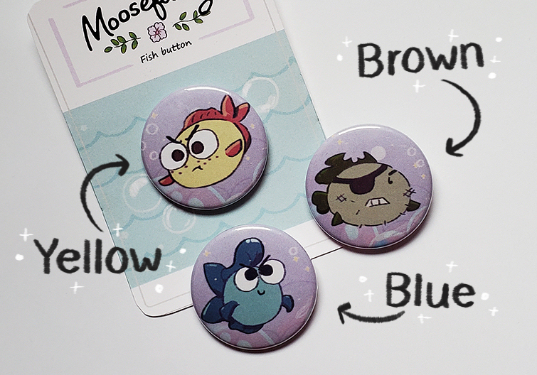 Super cute fish buttons in their different original designs. A cute blue greaser. A yellow short tempered puffer. And an old brown sailor fish.