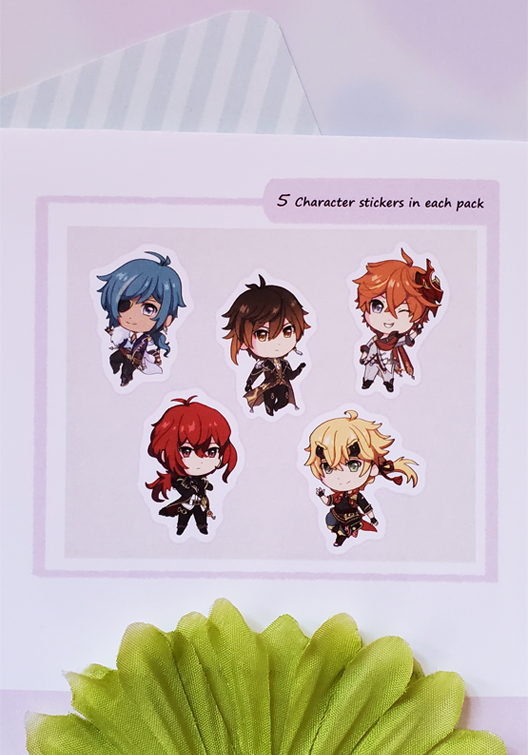 Each pack has 5 stickers. This sticker pack consist of 5 characters from the video game Genshin Impact. There is a husbando pack and a waifu pack.